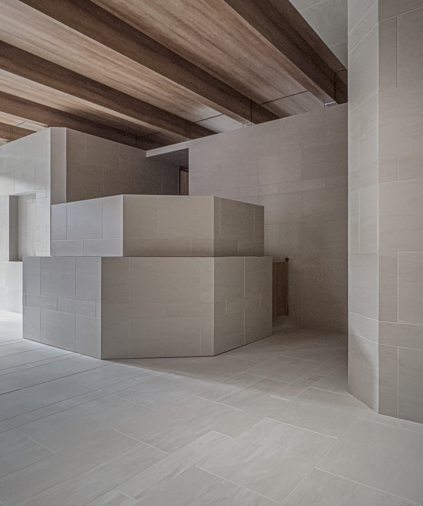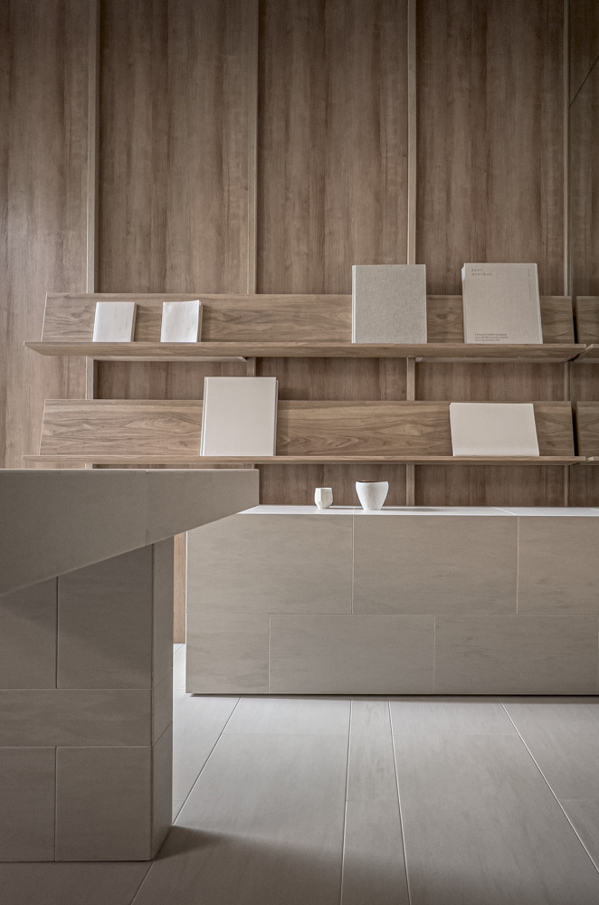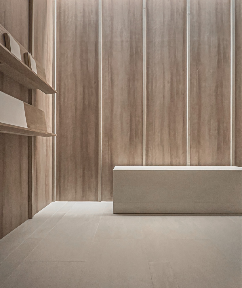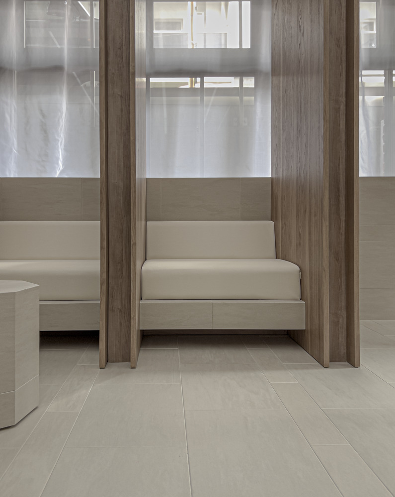 院内は心を整える居心地の観点から凹凸と陰影・色ムラ・グラデーション・自然素材などから空間を構成。梁型はベースライトの存在感を抑えつつ、天井から地下地中に漏れ落ちる光を演出、壁柱と合わせ形が根を暗喩しブランディングに寄与する。