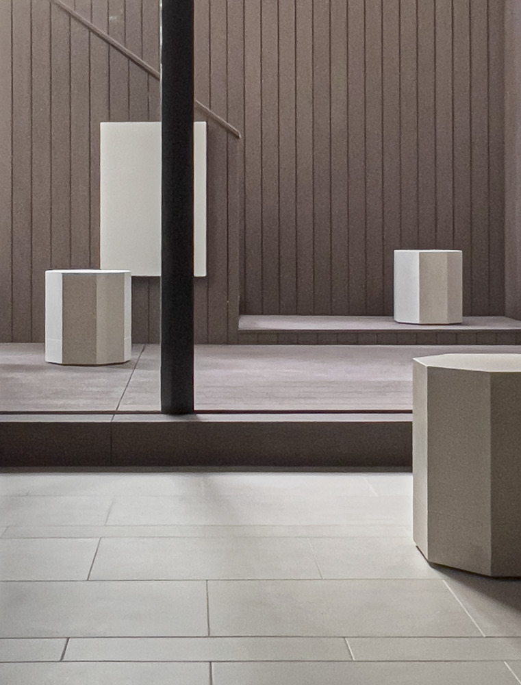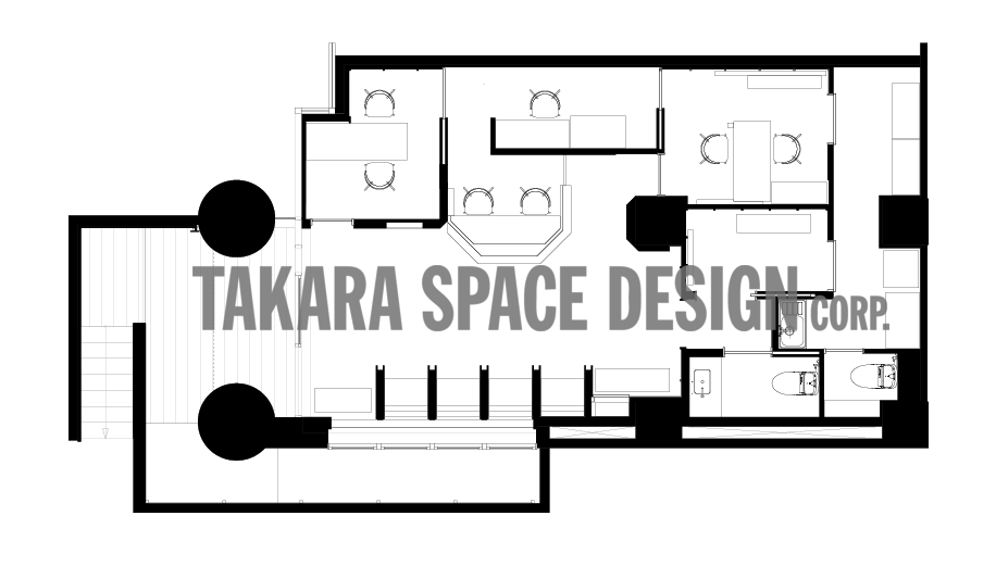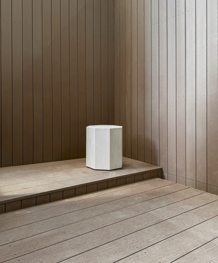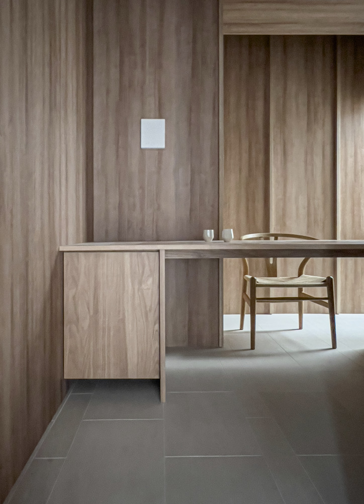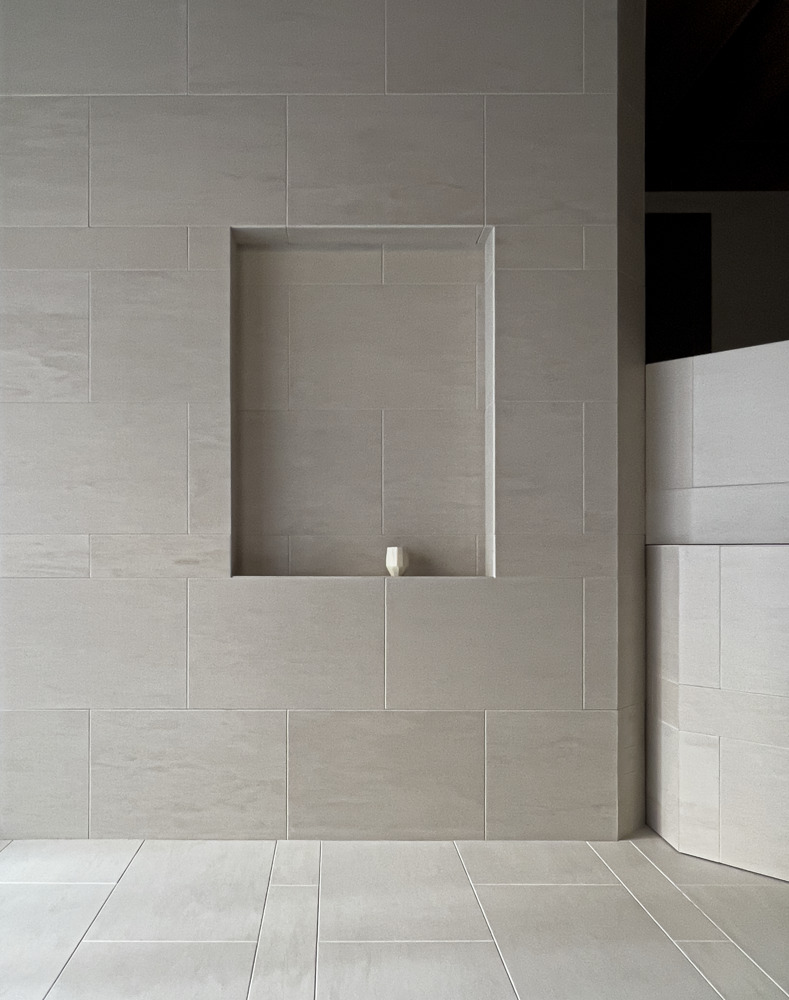 院内は心を整える居心地の観点から凹凸と陰影・色ムラ・グラデーション・自然素材などから空間を構成。梁型はベースライトの存在感を抑えつつ、天井から地下地中に漏れ落ちる光を演出、壁柱と合わせ形が根を暗喩しブランディングに寄与する。