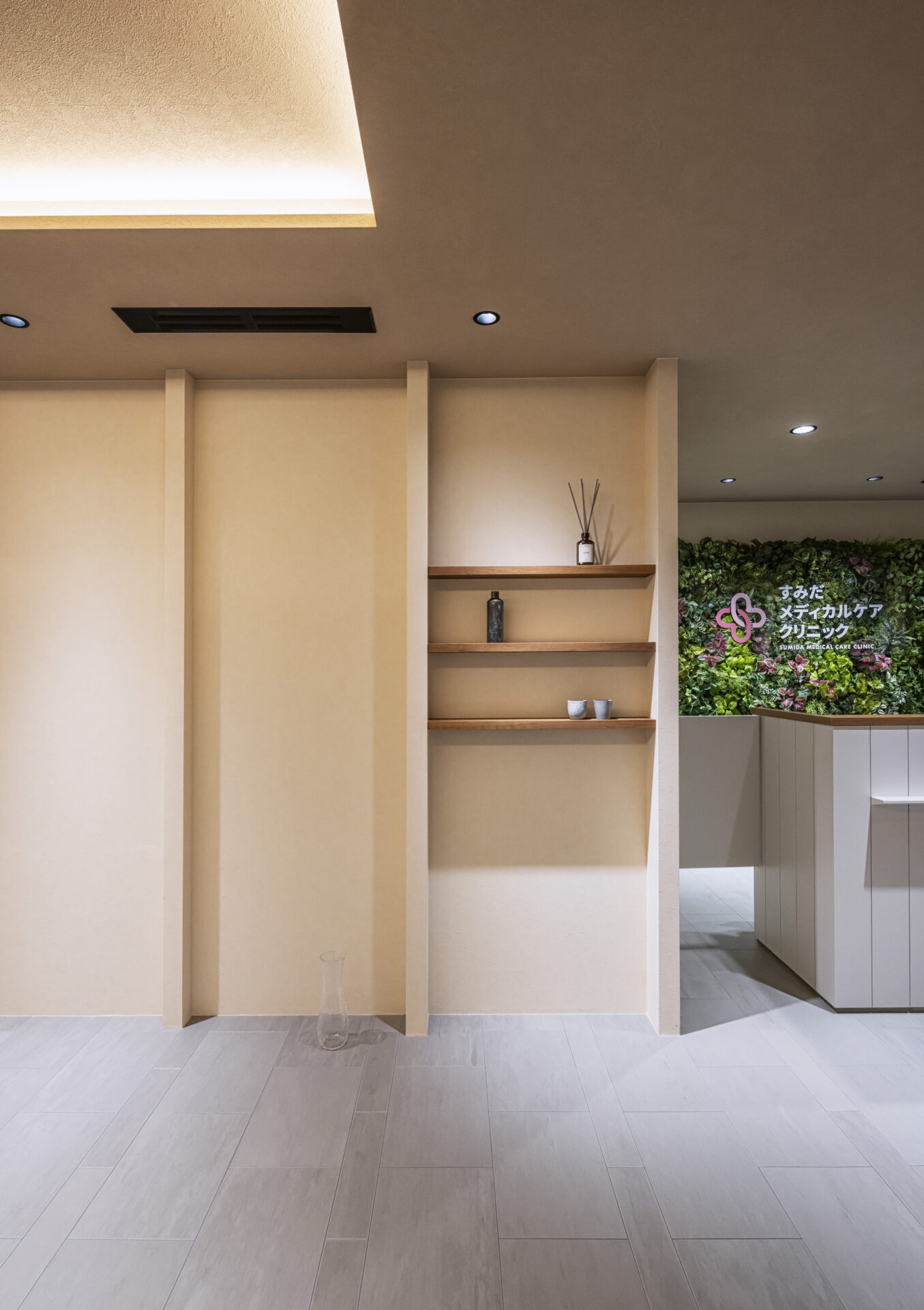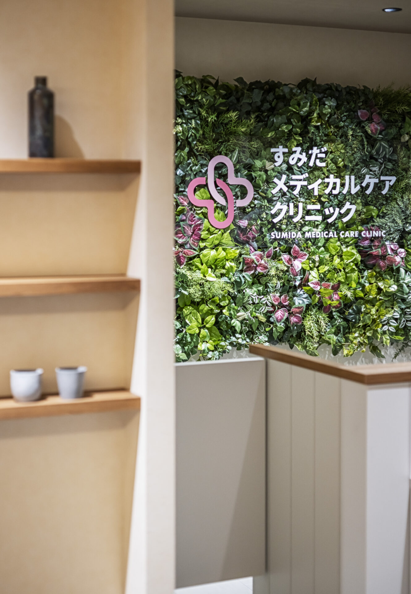 受付の壁にフェイクグリーンを用いし装飾を使用したことでクリニックにメリハリのあるイメージが生まれている