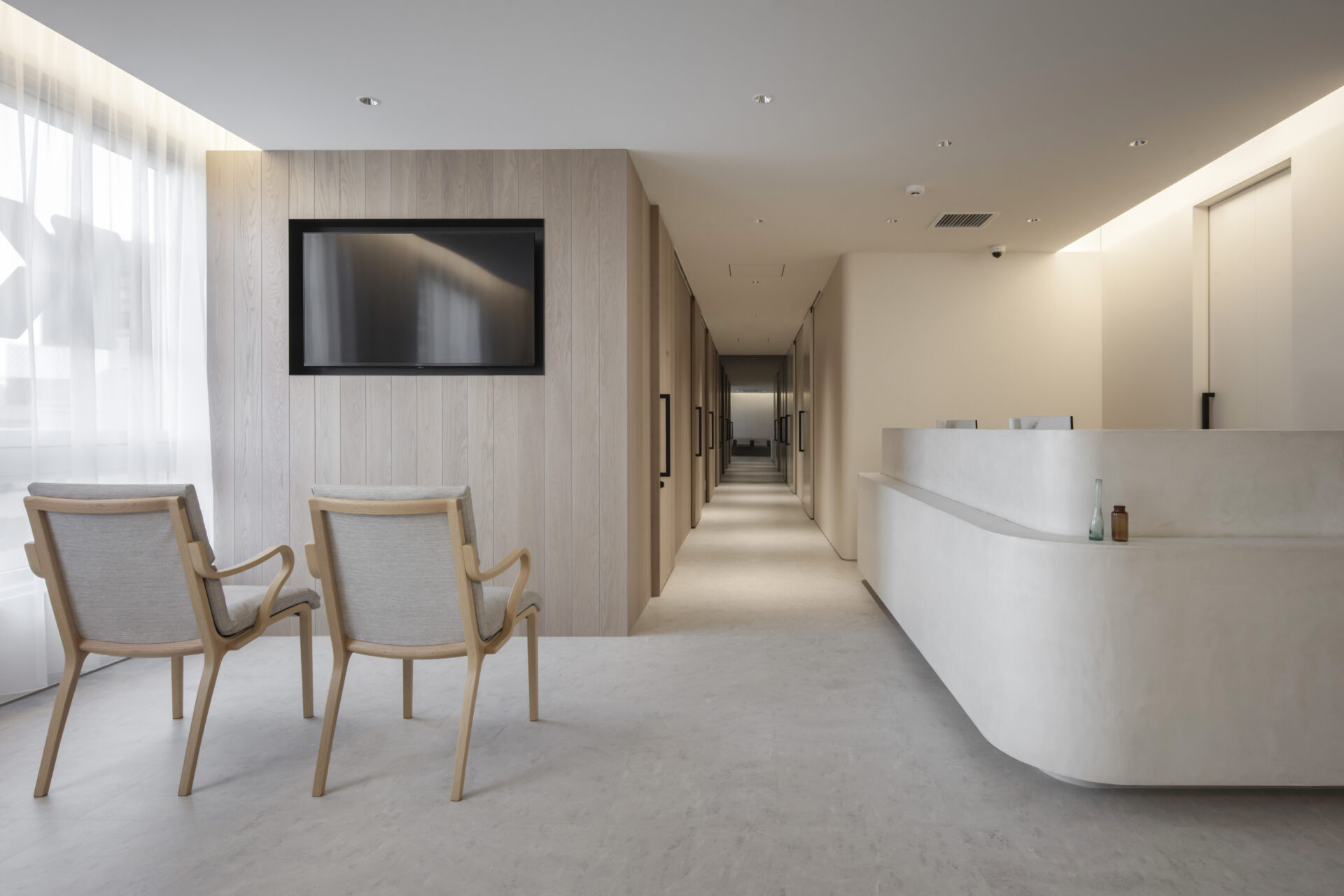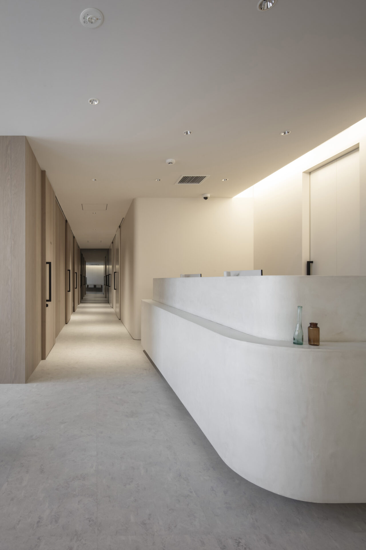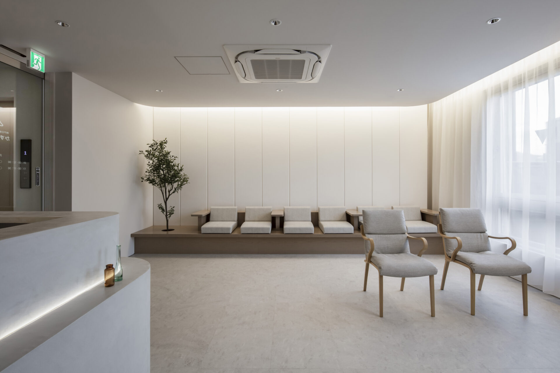 具体的操作として、医療空間特有の緊張感をやわらげ、なおかつ清潔感のある印象を与えるため、壁面・天井にアールを用いることとした。また部分的に布団張りをモチーフとした壁面も設けることで、空間の「かたさ」を軽減した。天井操作や間接照明が空間のエッジを和らげることに寄与し、開放感ある明るい空間とした。